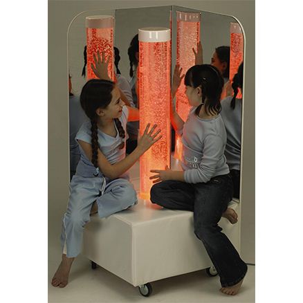 Bublinkový válec umístěný na měkkém vinylovém podstavci Soft Play, kompletní s akrylovým zrcadlem, uzamykatelnými kolečky a standardním bublinkovým válcem o výšce 1m. Barva vinylového podstavce dle přání zákazníka. Viz. 13-barevná škála na str. 14. (červená, růžová, žlutá, vanilková, světle zelená, limetková, tmavě zelená, modrá, světle modrá, tmavě modrá, fialová, černá a bílá)